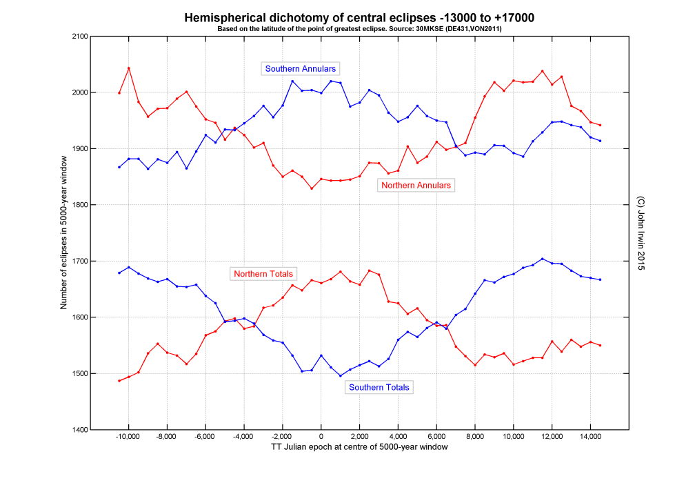 Hemispherical dichotomy of central eclipses -13000 to +17000
